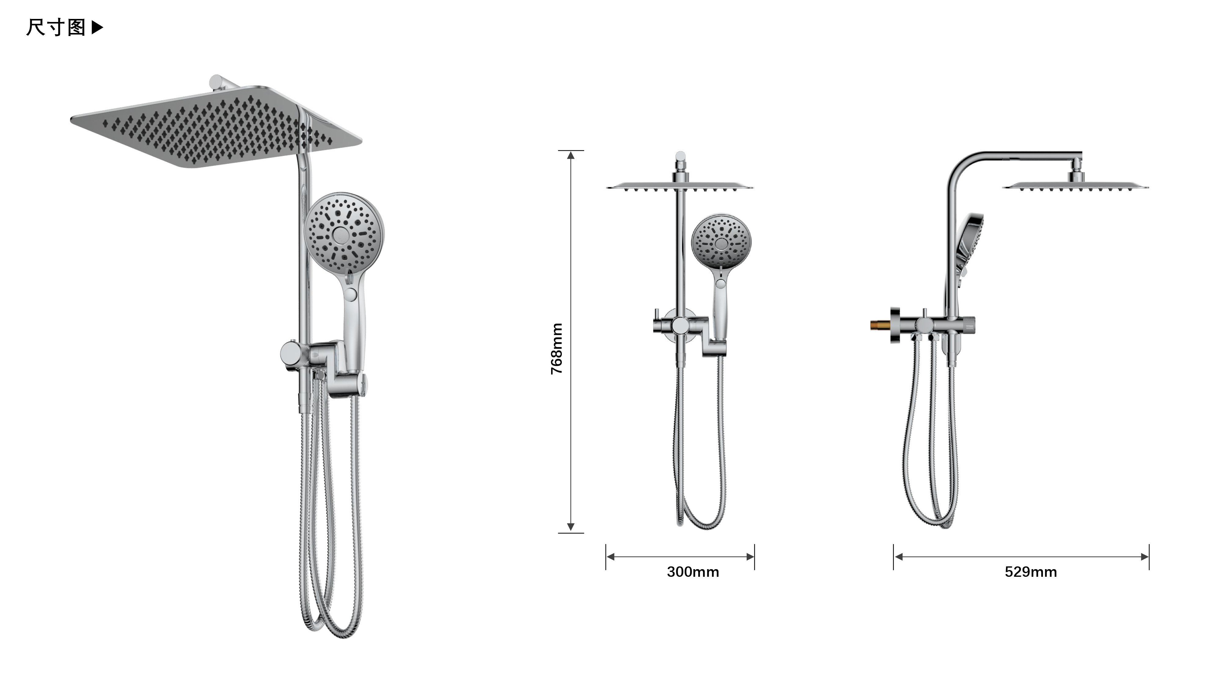 寬大頂噴富氧出水;十二功能花灑;Z字形三通